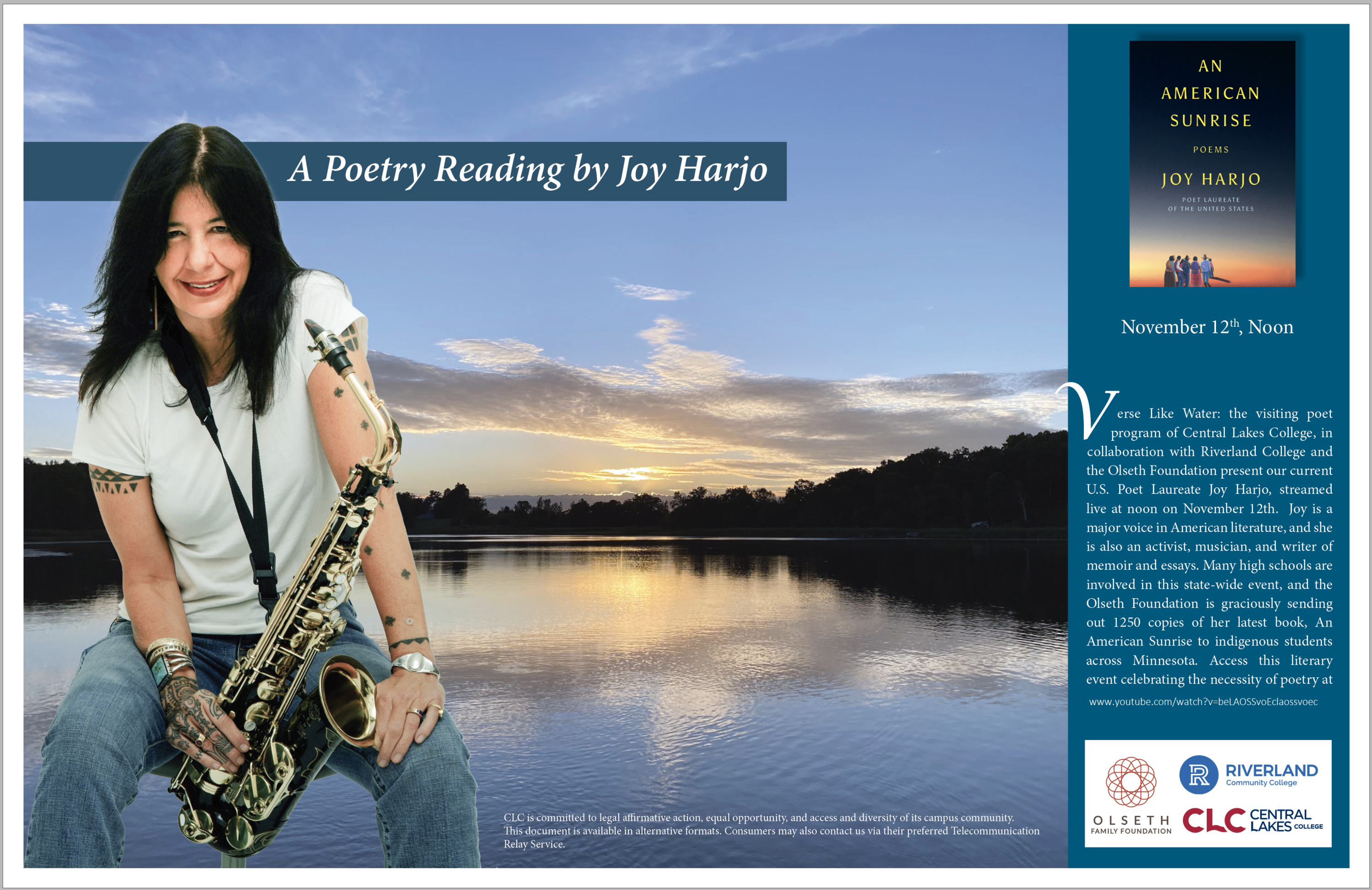 This event is part of a long running Poetry Reading Series, Verse Like Water, coordinated by CLC/Riverland Adjunct faculty member Jeff Johnson and local champion Jon Olseth. It is supported by multiple grants including the Olseth Family Foundation which has purchased 1,250 copies of Joy’s latest collection of poetry, An American Sunrise.
