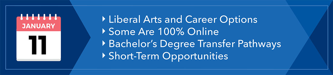 With a wide variety of offerings including the first two-years of a four-year education and short-term training designed to get you in the workforce fast, Spring Semester is the perfect time to get started on - or continue with - your college education.