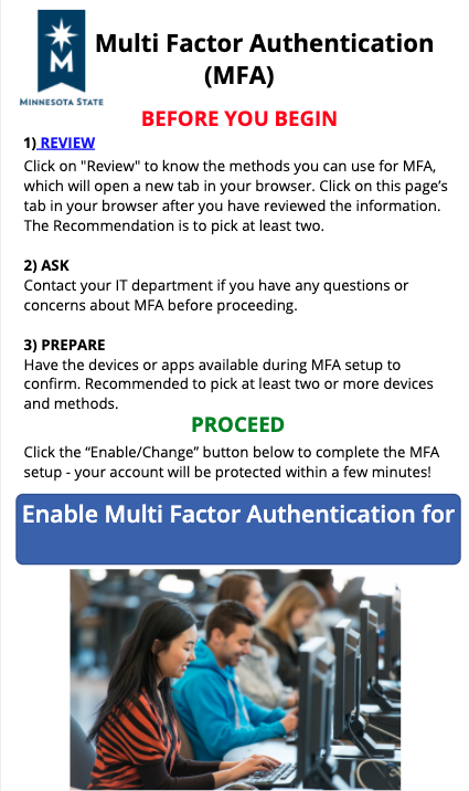 Other Minnesota State campuses have already completed their MFA projects. If you’ve enabled MFA with another Minnesota State campus you won’t need to do it again.