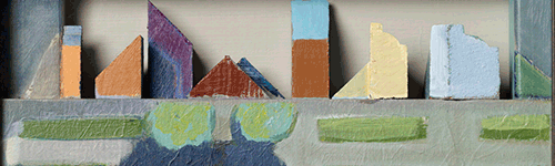 As a frequent commuter, Jeannine Kitzhaber's paintings and assemblages seek to manifest that experience, a ubiquitous one in the modern age. Rows of houses, painted and/or modeled in wood create patterned constellations that interact with roads, rivers and landscapes. Literally an overview of our shared surroundings, seen from a number of vantage points, Kitzhaber also addresses modes of representation in a continuing series of modifications from the literal to the diagrammatic, from the verbal to the three-dimensional. Kitzhaber has a Master's degree in painting from the University of Minnesota and currently teaches at the University of Wisconsin, River Falls. She has exhibited extensively throughout the metro region and elsewhere.